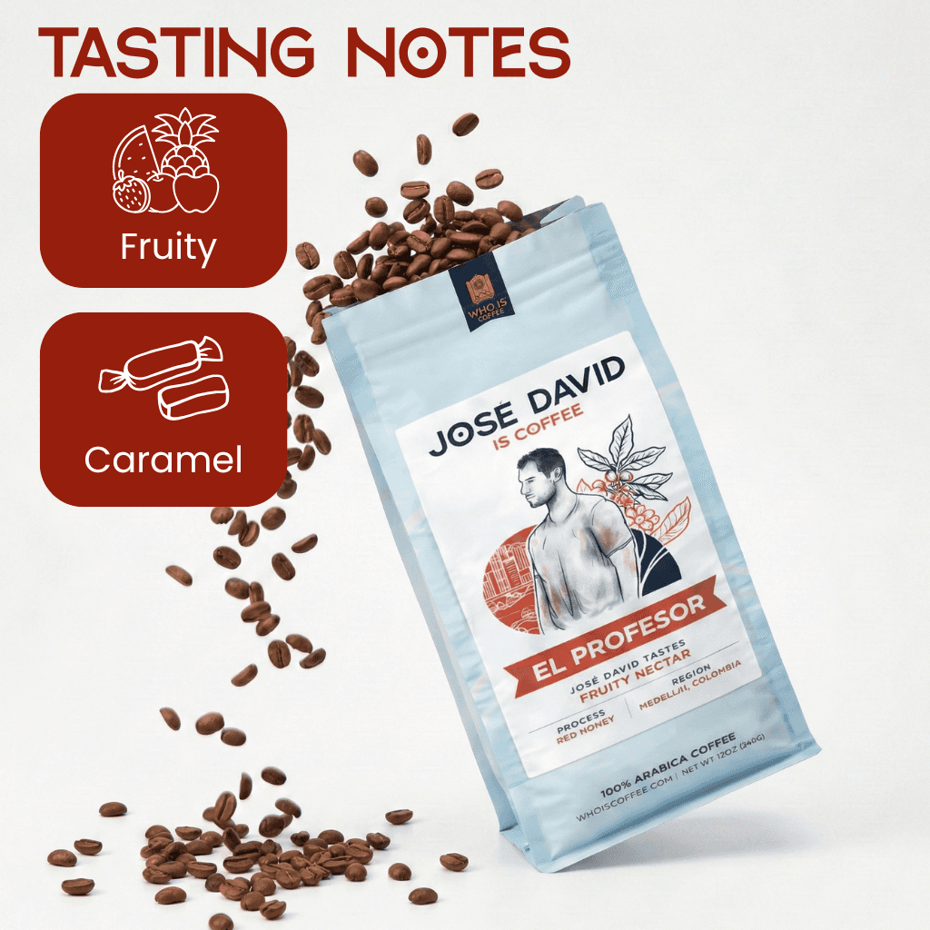 El Profesor is a honey-processed, medium roast from Jose David's farm in Medellin, offering a full-bodied start and a naturally sweet finish. It’s named for Jose’s life’s work—teaching farmers across Colombia how to produce specialty coffee that earns higher prices and creates lasting change. This coffee represents knowledge, generosity, and the power of sharing craft.